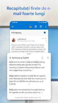 Transformați modul în care interacționați cu lumea digitală a muncii și a vieții personale. Cu Outlook pentru Android, aveți controlul total asupra priorităților. Spuneți adio aglomerației cu funcția inteligentă Mesaje prioritare, care plasează corespondența esențială direct în centrul atenției dumneavoastră, asigurându-vă că nu ratați niciodată ce contează cu adevărat. De la gestionarea impecabilă a emailurilor la programarea eficientă a întâlnirilor, trecerea între inbox și calendar este acum o experiență fluidă și intuitivă. Marcați-vă disponibilitatea sau adăugați un eveniment nou cu doar câteva atingeri. Chiar și atașarea documentelor importante devine o sarcină trivială, accesând fișierele relevante direct din aplicație.