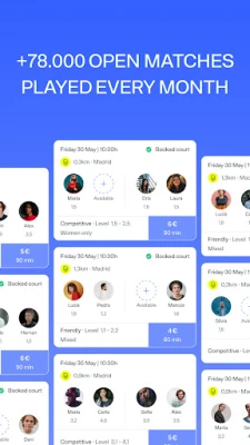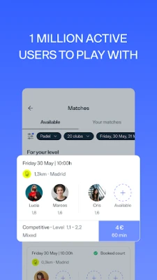 Organizați cu ușurință meciul ideal, adaptat preferințelor voastre. Creați partide private în cluburile favorite sau pe terenuri acoperite, sau faceți-le publice pentru ca alți entuziaști să se alăture distracției. De asemenea, aveți libertatea de a vă înscrie la meciuri deja stabilite, bucurându-vă de control deplin asupra experienței voastre de joc. Playtomic dispune de o rețea extinsă de peste 18.000 de terenuri de padel, atât în aer liber, cât și indoor, la nivel global, asigurându-vă acces instant la locația perfectă. Rezervarea unui teren se realizează fără efort, cu opțiunea flexibilă de a achita integral taxa sau de a împărți costurile cu ceilalți participanți.