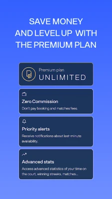 Abonamentul Premium deblochează o experiență fără limite, optimizată pentru pasionații de padel. Beneficiați de economii substanțiale la fiecare tranzacție și evitați taxele suplimentare pentru rezervările de terenuri. Alertele personalizate cu prioritate vă mențin informat în timp real despre meciuri, disponibilitatea terenurilor și oportunități de ultim moment, adaptate strict preferințelor voastre. Promovați-vă eficient meciurile: atât partidele create, cât și cele la care vă alăturați vor fi etichetate ca „Meciuri Gold", atrăgând astfel mai mulți jucători și asigurându-vă instantaneu un teren disponibil. În plus, accesați statistici avansate și detaliate despre performanța voastră – urmăriți-vă seria de victorii, identificați-vă cei mai redutabili adversari și comparați-vă progresul cu alți jucători, totul pentru a vă îmbunătăți continuu jocul. Alegeți Playtomic Premium și transformați fiecare joc într-o oportunitate de excelență!